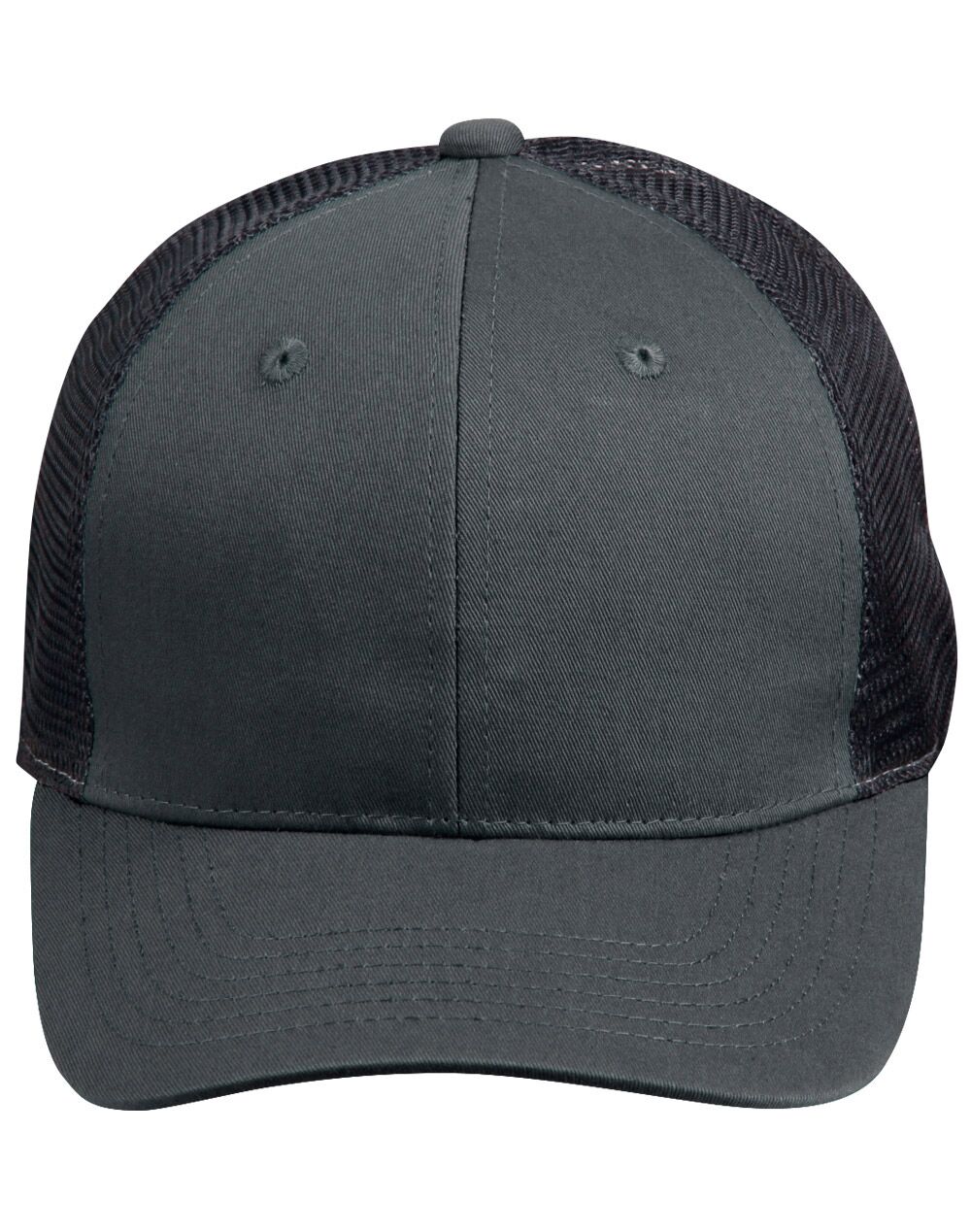 Description: 6 panel pre-curved peak trucker cap. Laid back structured front with back Nylon mesh. Embroidered eyelets. Adjustable fabric velcro closure.