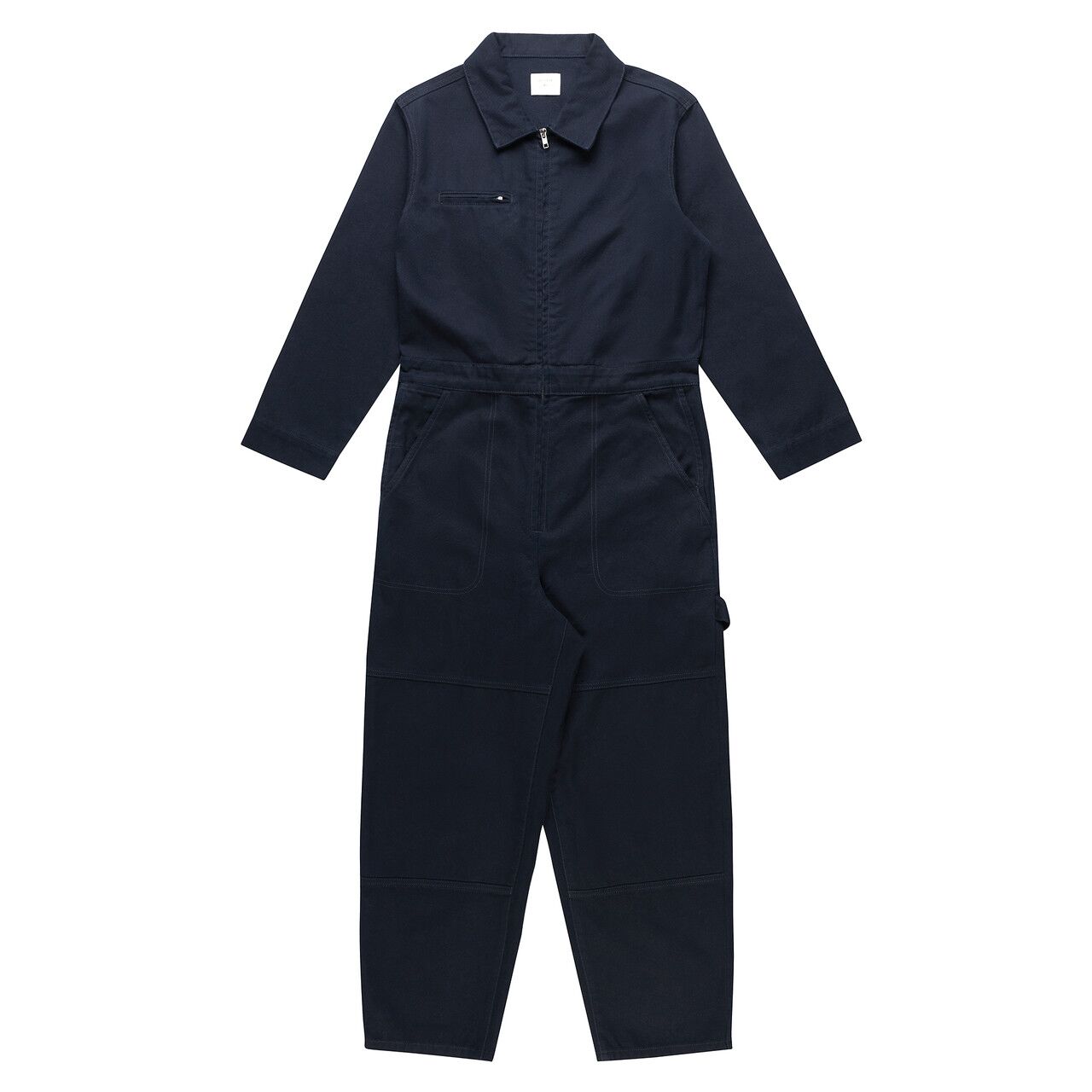 100% Cotton Duck canvas, Collared all-in-one, adjustable shoulder straps, YKK zip front, 6 pockets, top stitch detailing, Elastic at center back, hammer loop, zip close chest pocket, internal access at pocket, double patch knees