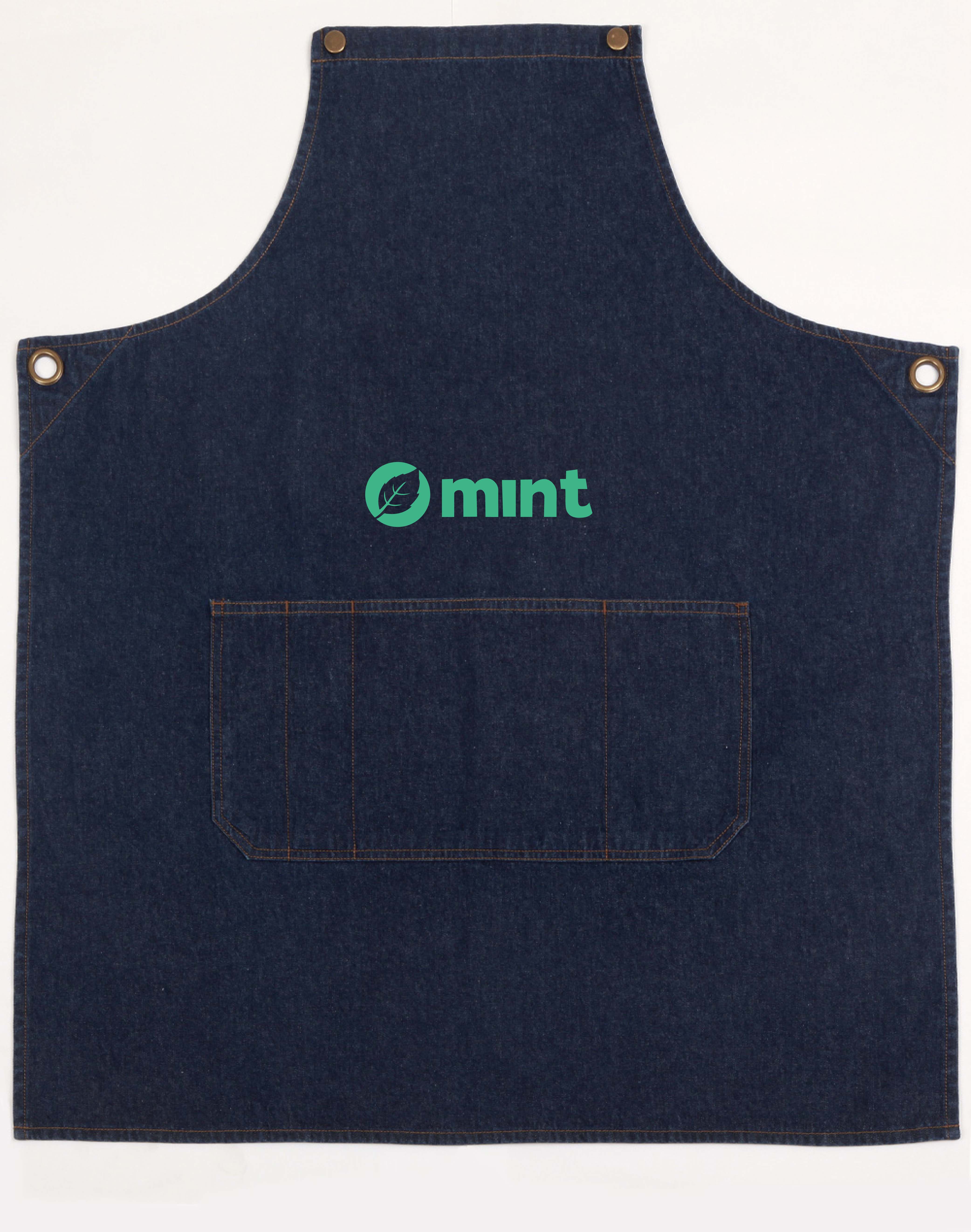Style: Cross back Denim Bib Apron with antique brass eyelets and studs,contrast denim stitching. Apron includes 4 front pockets and 2 top pen pockets. Apron will come with colour matched straps unless otherwise requested
