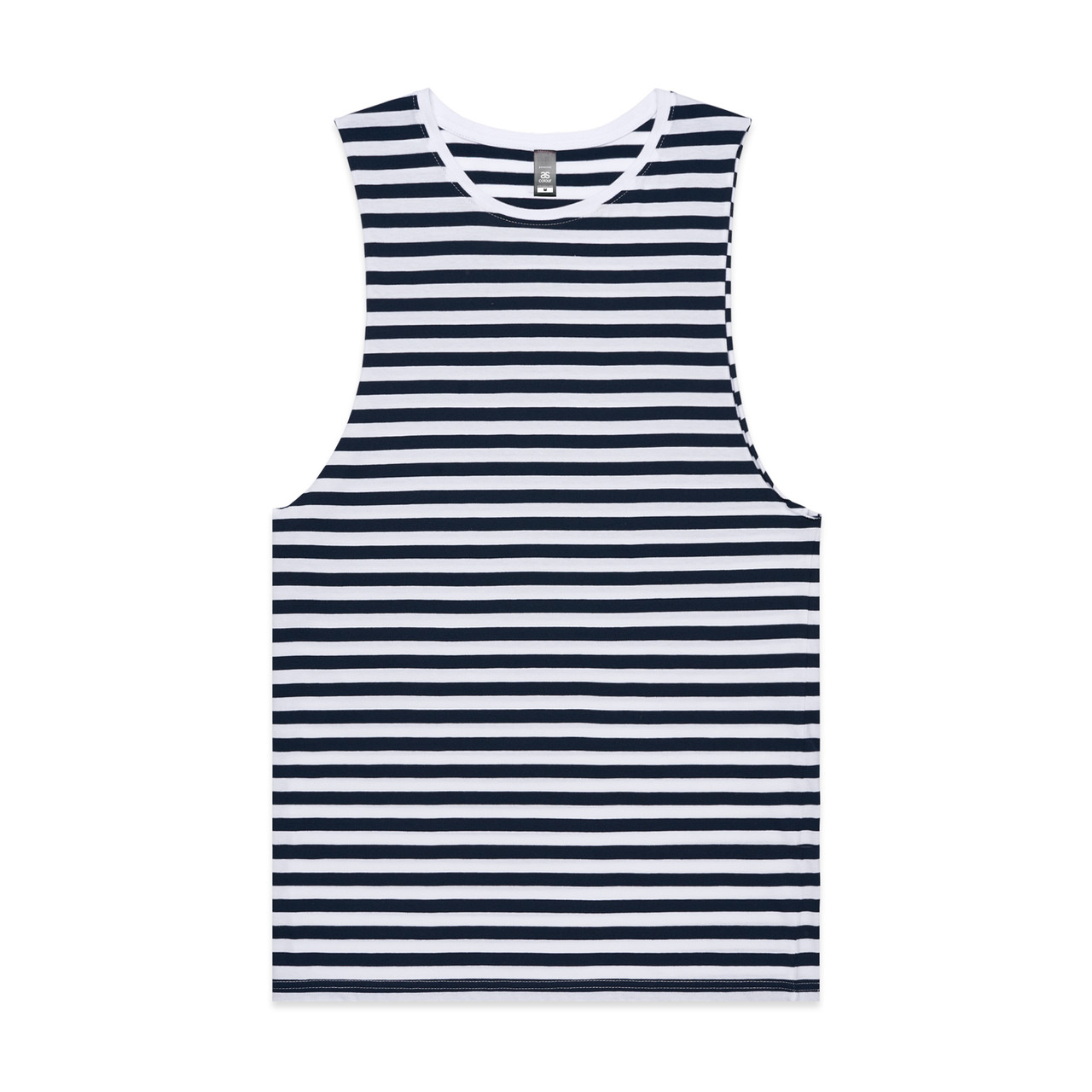 Sleeveless tank, raw armhole edges, varied stripe width across colours