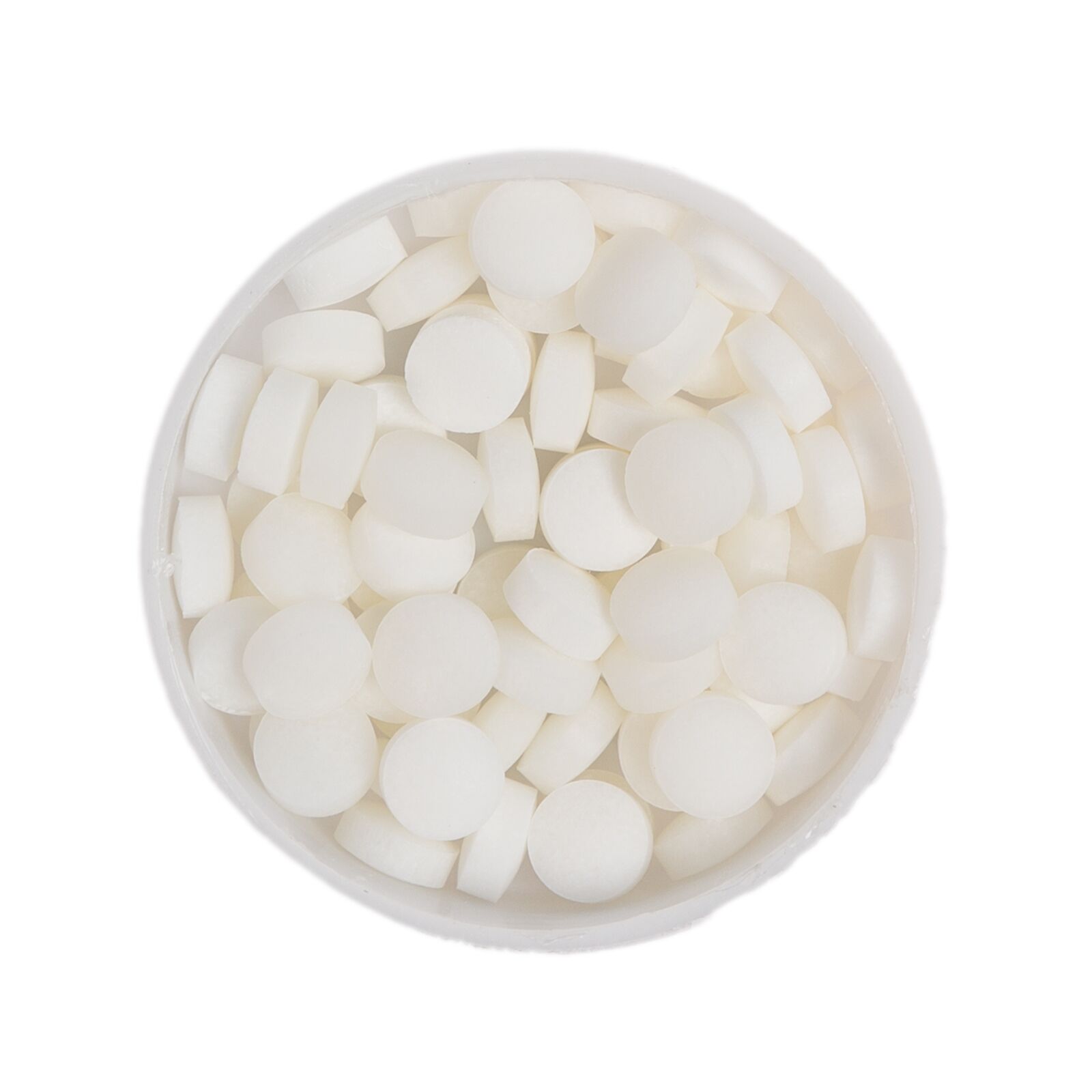 Plastic container with 60 sugar free mints (approx). Foil sealed click lock tin lid.