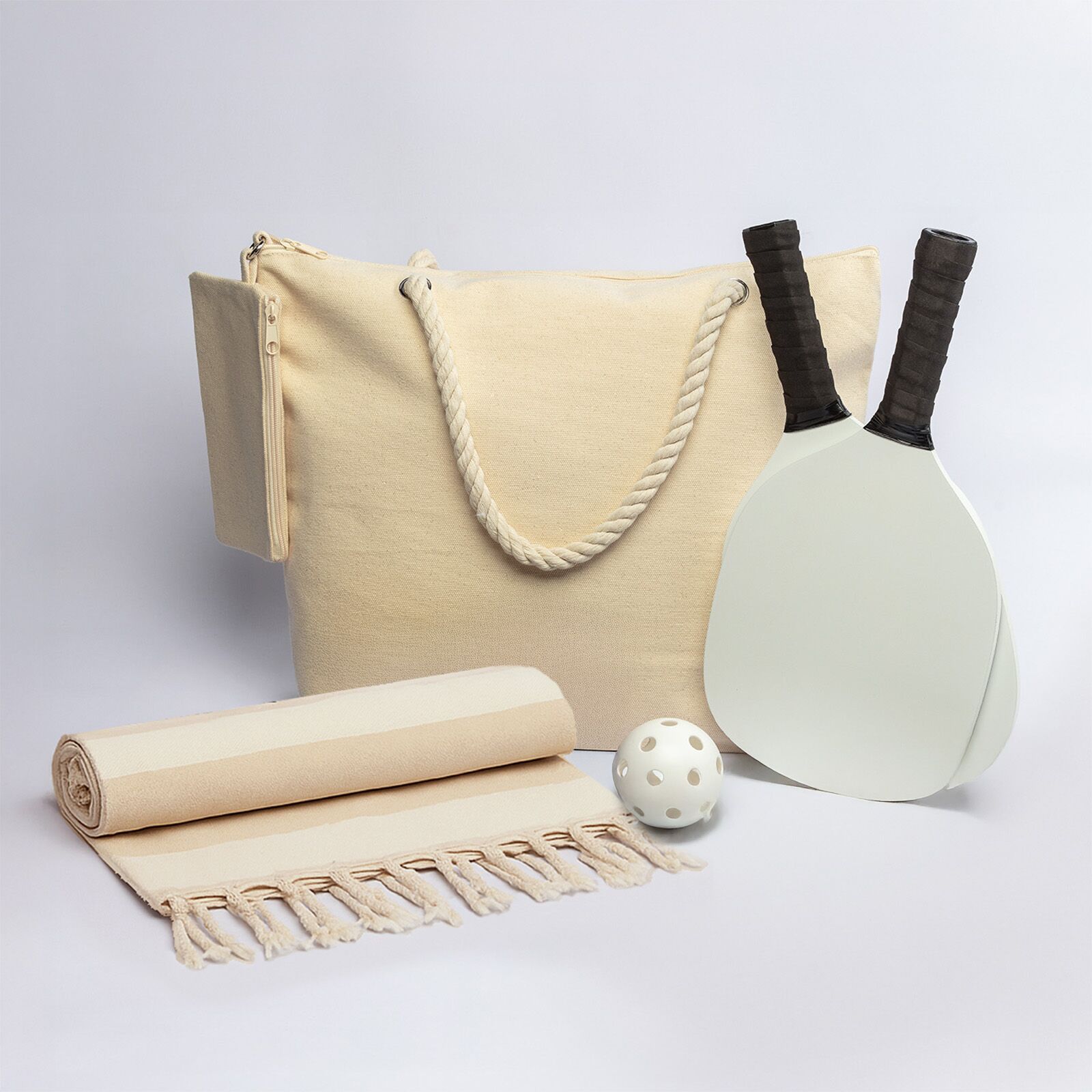 Take it outside. Stylish, towel-packed, and ready to rally – this set is made for sunshine and spontaneous fun. Inside, there’s a pickleball set for instant action, and a soft beige Turkish-style towel for drying off or laying out. It all comes packed in a premium canvas tote with soft carry handles and a zipped top to keep things secure. Just add good weather and it’s game on. The Courtside Carry is perfect for team offsites, summer promotions, active client gifts or sporty onboarding moments that bring the energy. What’s Inside? 1 × Pickleball set – includes 2 × MDF bats (380 × 190mm), 1 × ball, and a 10oz polycotton drawstring pouch, 1 × Nicola Spring Beige Turkish-style towel – soft, lightweight, and versatile for beach or park days, Presented in a high-quality canvas tote bag – with rope handles, zipper closure, and a detachable internal pouch for essentials.