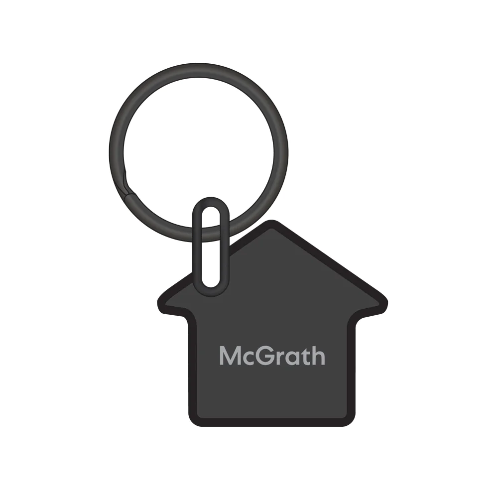 Metal house-shaped key ring with a gunmetal plated finish on both sides which can be laser engraved to a natural etch. It is beautifully presented in a black gift box.