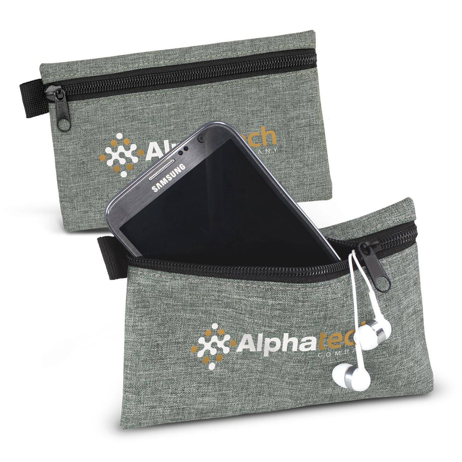 Handy pouch for storing a phone or power bank and any other tech accessories. The pouch is manufactured from 300D polyester which has a two-tone heather style finish. Other features include a black zippered closure and a woven loop for attaching or hanging the pouch as needed.