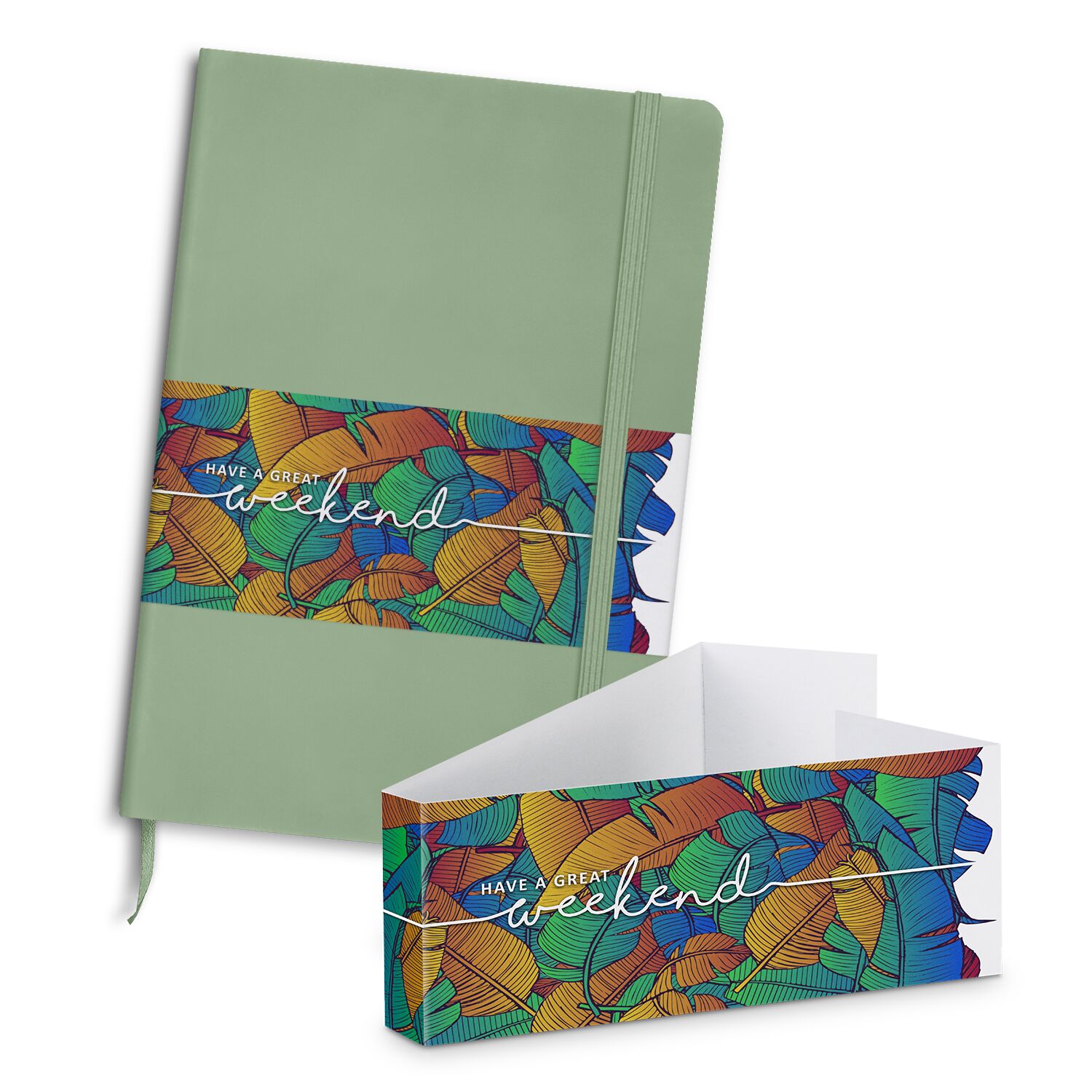 Smart medium-size (approximately A5) notebook with 80 leaves (160 pages) of 70gsm lined white paper and a hard cover PU cover. It has an elastic closure band and a bookmark ribbon. An optional paper belly band is available on request and can be branded in full colour.