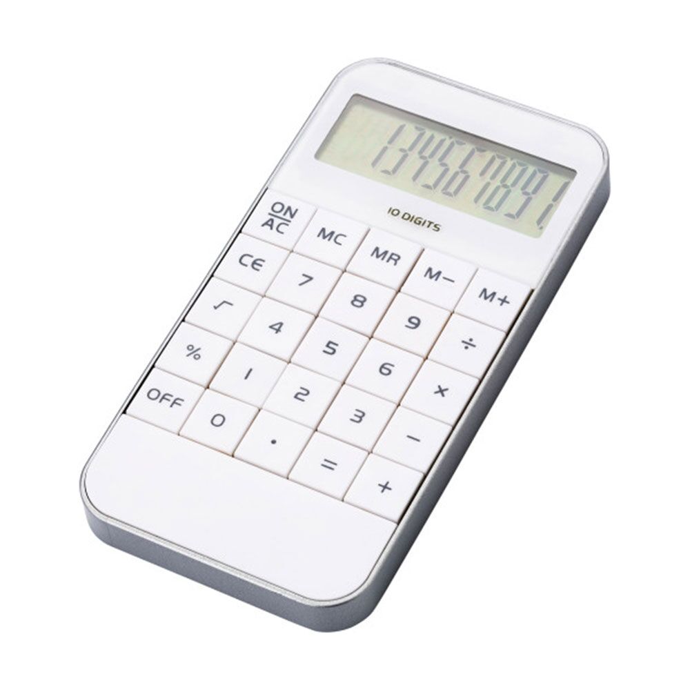 ABS mobile phone shaped ten digit calculator with silver coloured rim, including memory, percentage, and square root calculation functions, batteries included. Item Size: 5.8 x 11.5 x 1.0cm