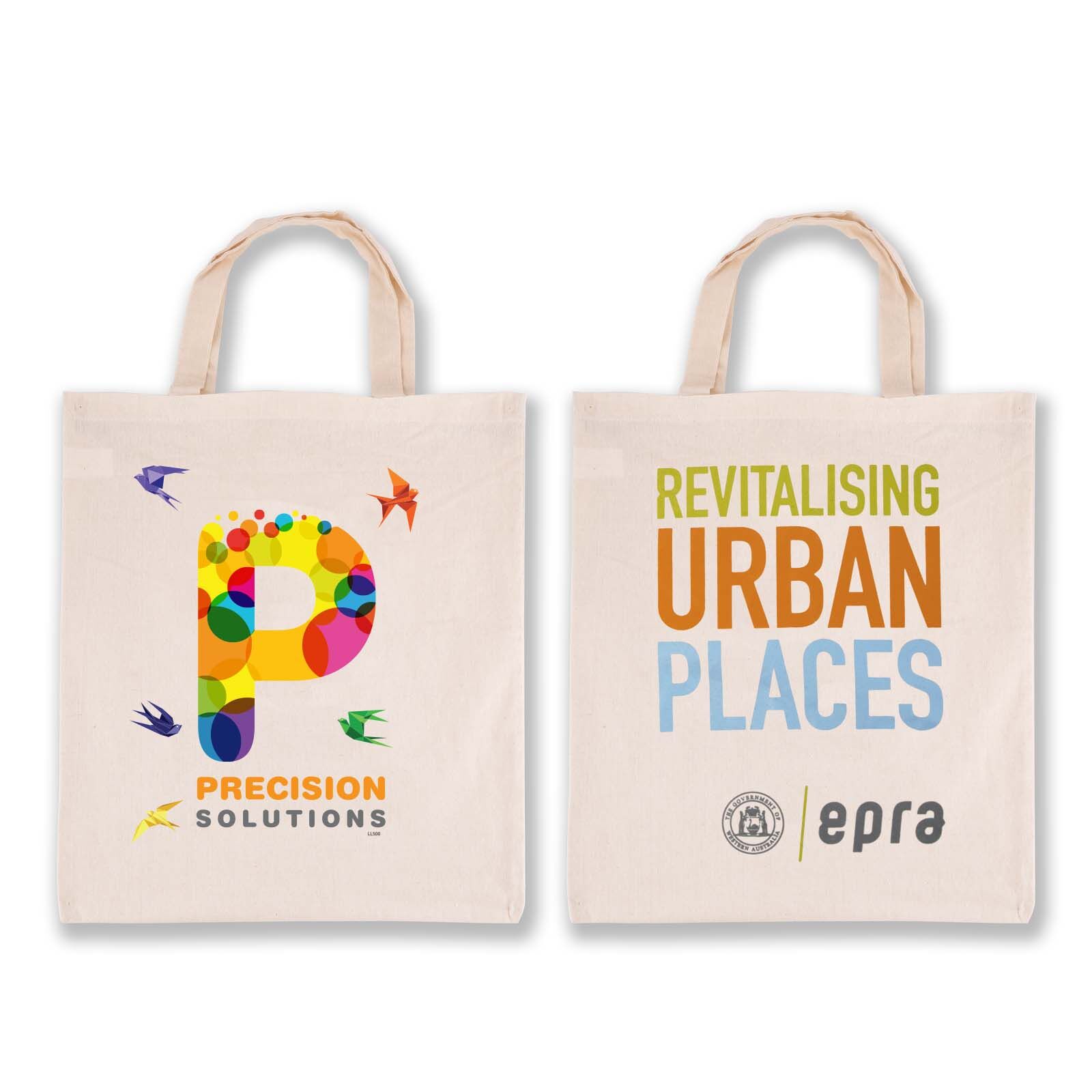 Double short handle calico tote bags. Ideal for environmental projects as calico is a renewable resource.