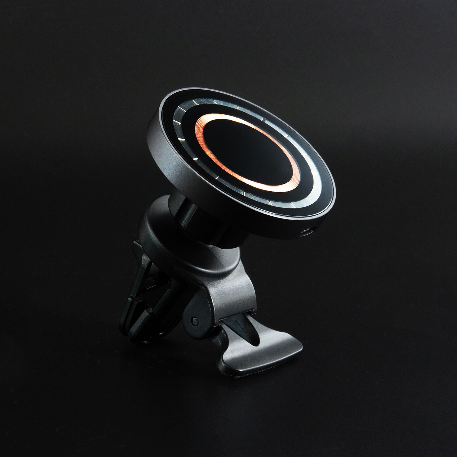 The Arc Wireless Car Charger blends innovation with elegance to deliver quality performance while on the road. Designed to seamlessly integrate into everyday life, this 15W charger clips firmly onto any car vent and features an adjustable brace for additional support. The charger comes with a metal ring for non MagSafe phones, ensuring compatibility with any device. Additional features include LED charging indicator lights, one handed placement, and the ability to use your device in either portrait or landscape positions. The sleek black glass finish, refined copper accents, and quality components make this a standout accessory. Presented in a beautifully crafted INGENIO gift box, it is ideal for corporate gifting, and the ultimate brand statement. INGENIO – Designed to lead, built to last, made to inspire.